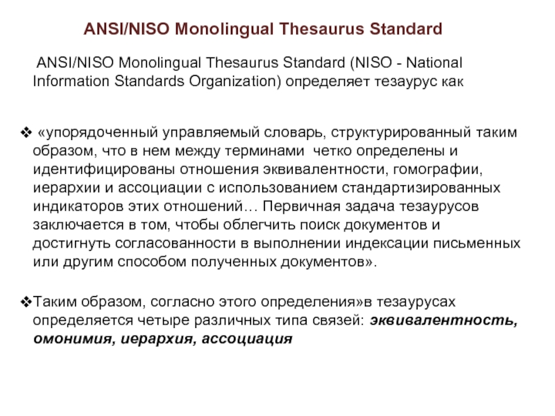 единиц некоторого языка с заданной на нём системой семантических отношений. Тезаурус фактически определяет семантику языка (национального языка, языка конкретной науки или формализованного языка для автоматизированной системы управления).