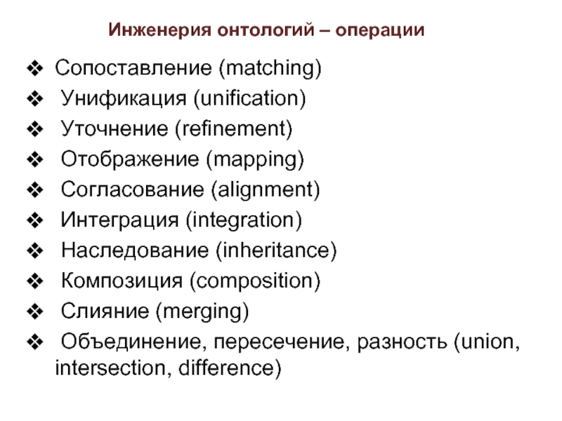 Слайд 61Манипулирование онтологиями – операции интеграции и наследования
