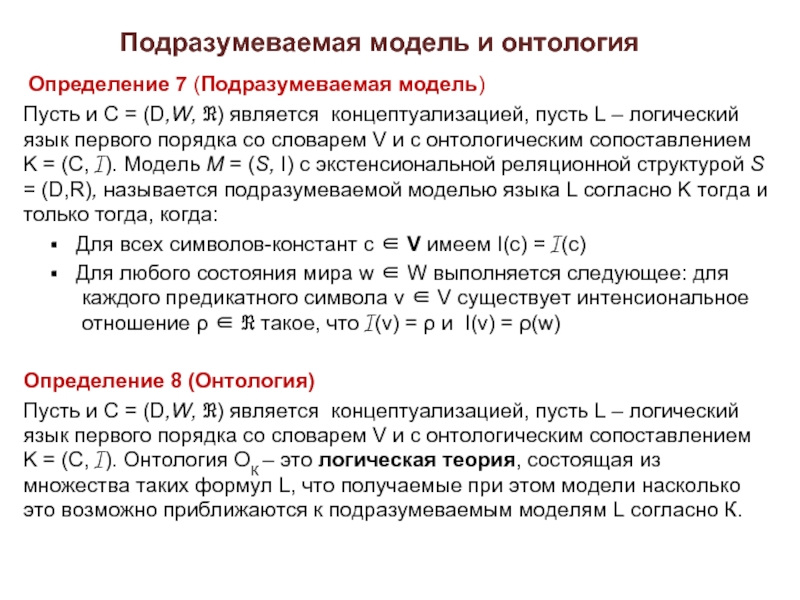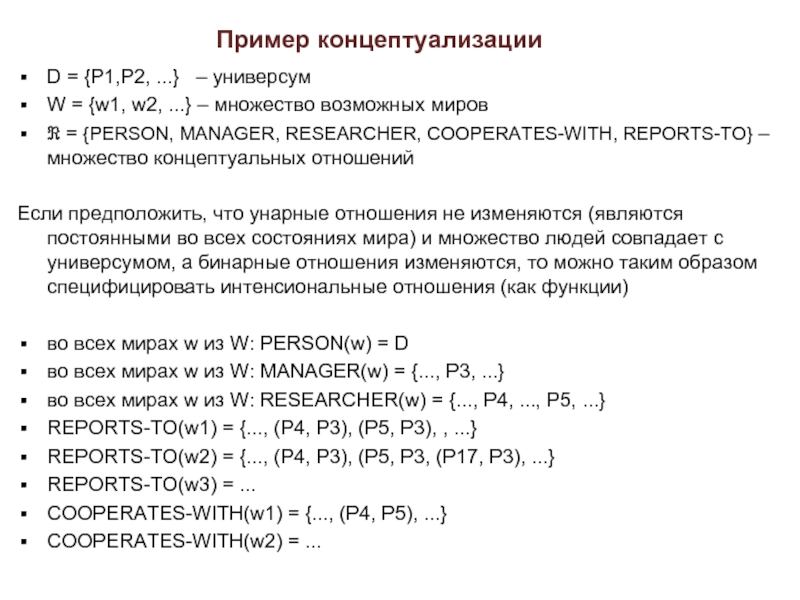 явным перечислением принадлежащих ему индивидов, то есть экстенсионально (в этом случае индивид имеется в ПО, если он явно задан приписан классу)