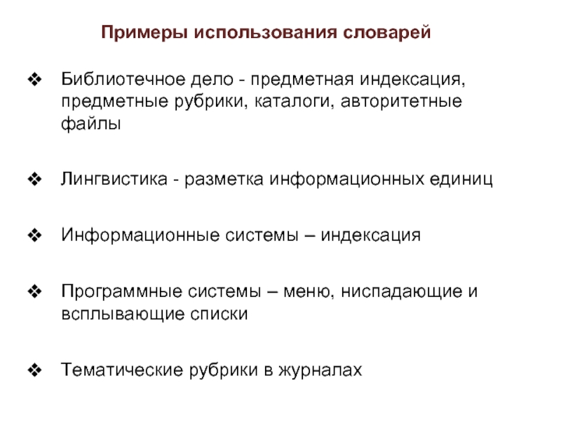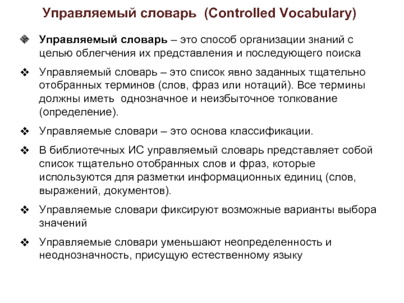В библиотечных ИС управляемый словарь представляет собой список тщательно отобранных слов и фраз, которые используются для разметки информационных единиц (слов, выражений, документов).