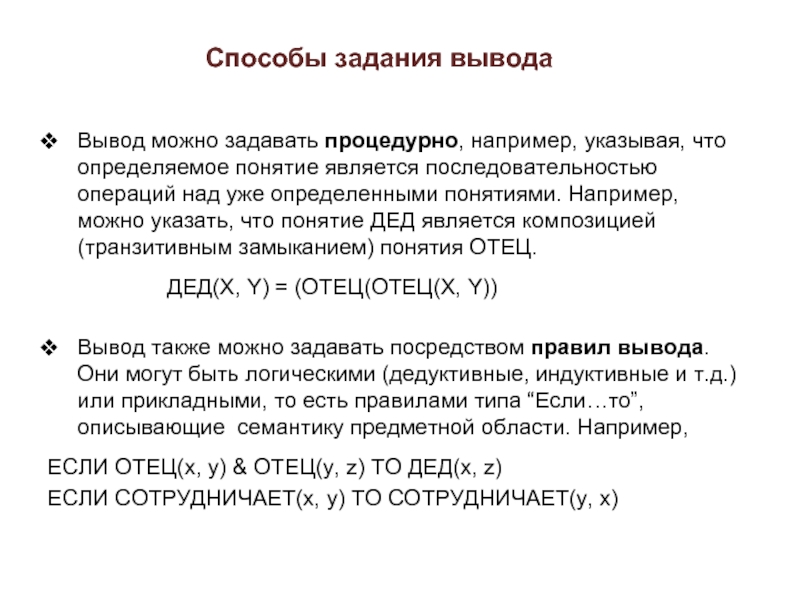 Вывод можно задавать процедурно, например, указывая, что определяемое понятие