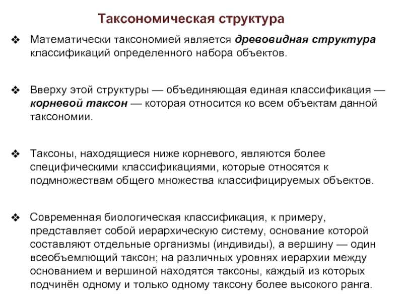 этой структуры — объединяющая единая классификация — корневой таксон — которая относится ко всем объектам данной таксономии.