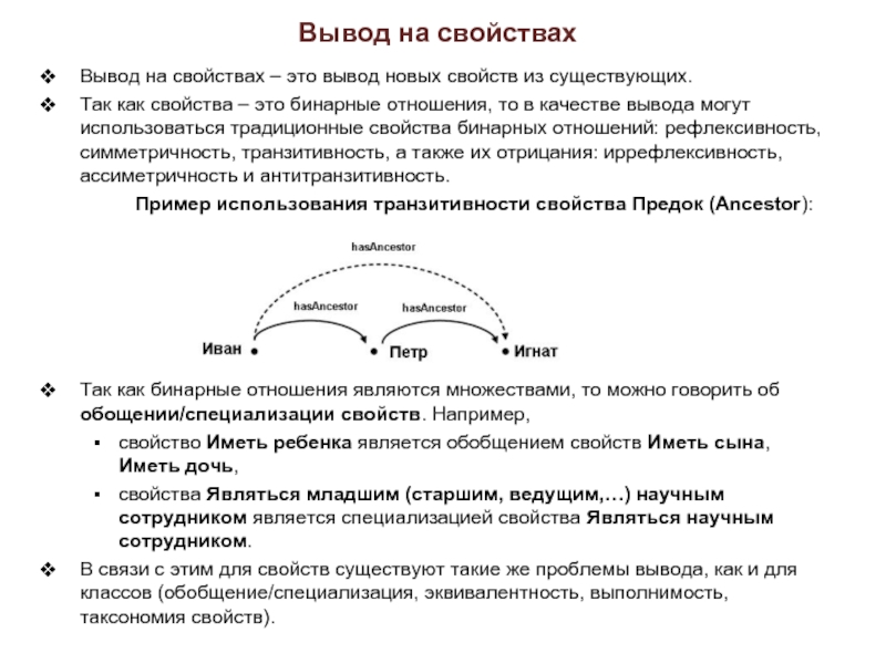 Так как свойства – это бинарные отношения, то в качестве вывода могут использоваться традиционные свойства бинарных отношений: рефлексивность, симметричность, транзитивность, а также их отрицания: иррефлексивность, ассиметричность и антитранзитивность.