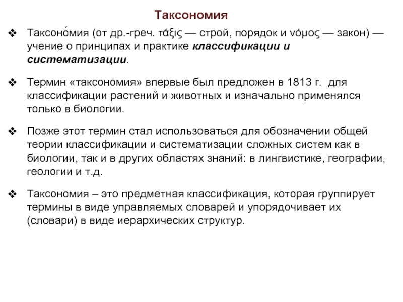 Таксономия – это предметная классификация, которая группирует термины в виде управляемых словарей и упорядочивает их (словари) в виде иерархических структур.