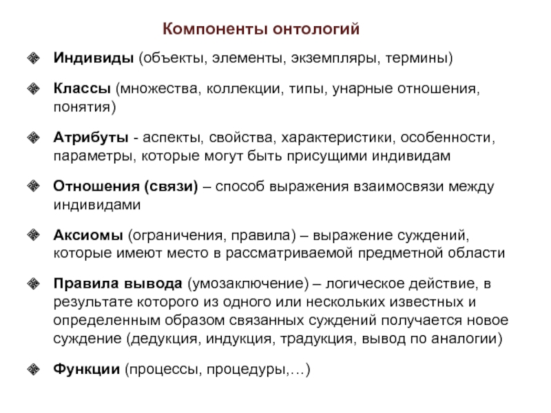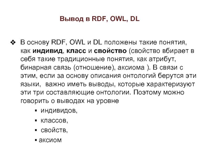 такие понятия, как индивид, класс и свойство (свойство вбирает в себя такие традиционные понятия, как атрибут, бинарная связь (отношение), аксиома ). В связи с этим, если за основу описания онтологий берутся эти языки, важно иметь выводы, которые характеризуют эти три составляющие онтологии. Поэтому можно говорить о выводах на уровне
