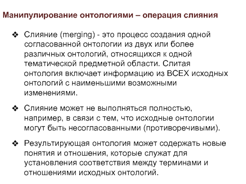 согласованной онтологии из двух или более различных онтологий, относящихся к одной тематической предметной области. Слитая онтология включает информацию из ВСЕХ исходных онтологий с наименьшими возможными изменениями.