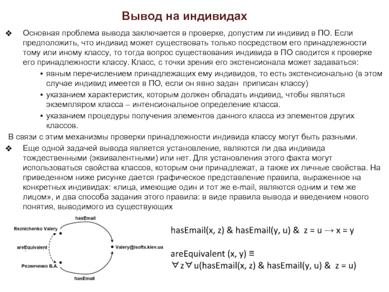 Еще одной задачей вывода является установление, являются ли два индивида тождественными (эквивалентными) или нет. Для установления этого факта могут использоваться свойства классов, которым они принадлежат, а также их личные свойства. На приведенном ниже рисунке дается графическое представление правила, выраженное на конкретных индивидах: «лица, имеющие один и тот же e-mail, являются одним и тем же лицом», и два способа задания этого правила: в виде правила вывода и введением нового понятия, выводимого из существующих