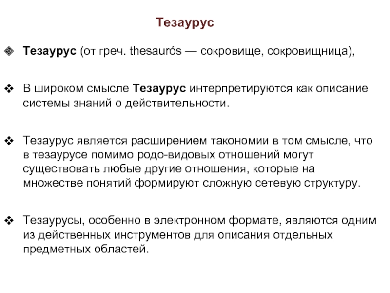 Тезаурусы, особенно в электронном формате, являются одним из действенных инструментов для описания отдельных предметных областей.