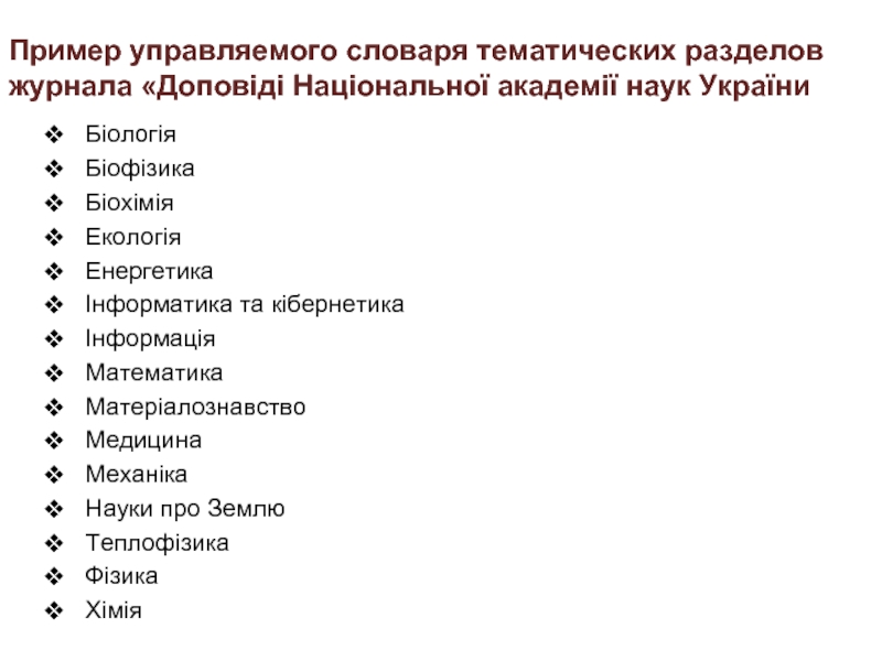 Слайд 15Пример управляемого словаря тематических разделов журнала «Доповiдi Нацiональної академiї наук України