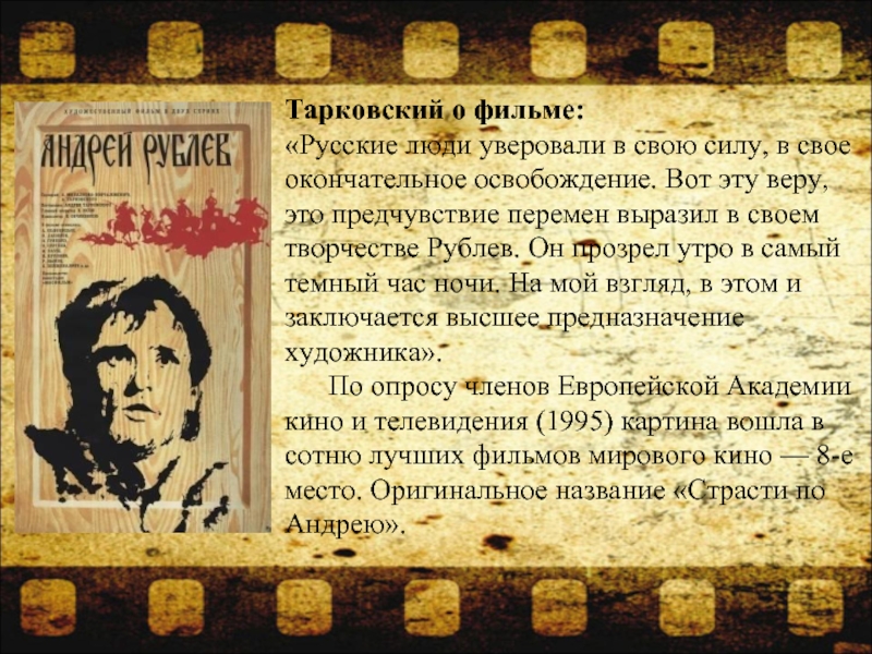 По опросу членов Европейской Академии кино и телевидения (1995) картина вошла в сотню лучших фильмов мирового кино — 8-е место. Оригинальное название «Страсти по Андрею».