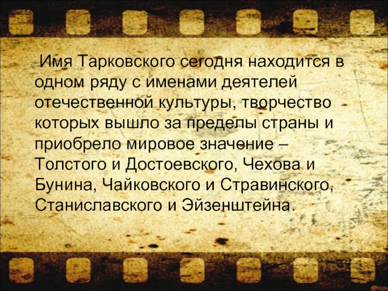 Слайд 2 Имя Тарковского сегодня находится в одном ряду с именами деятелей отечественной