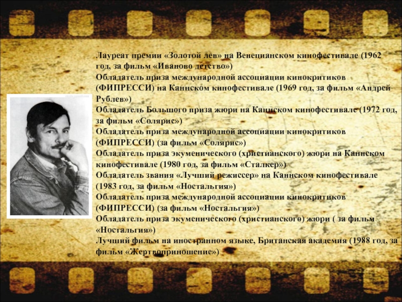 Обладатель приза международной ассоциации кинокритиков (ФИПРЕССИ) на Каннском кинофестивале (1969 год, за фильм «Андрей Рублев»)