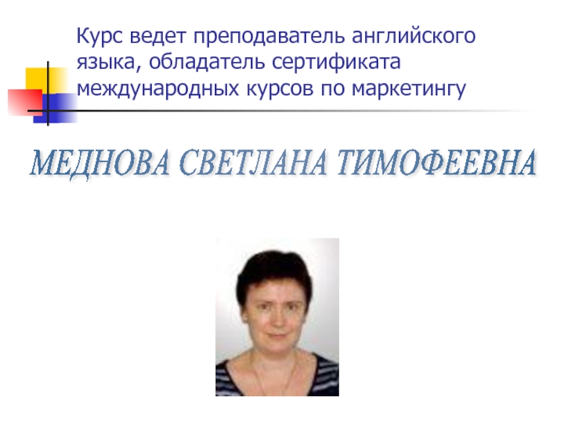 Слайд 10Курс ведет преподаватель английского языка, обладатель сертификата международных курсов по маркетингу