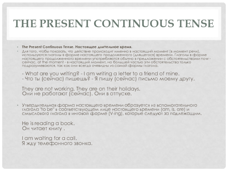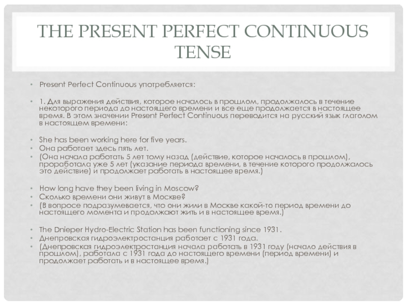 действия, которое началось в прошлом, продолжалось в течение некоторого периода до настоящего времени и все еще продолжается в настоящее время. В этом значении Present Perfect Continuous переводится на русский язык глаголом в настоящем времени: