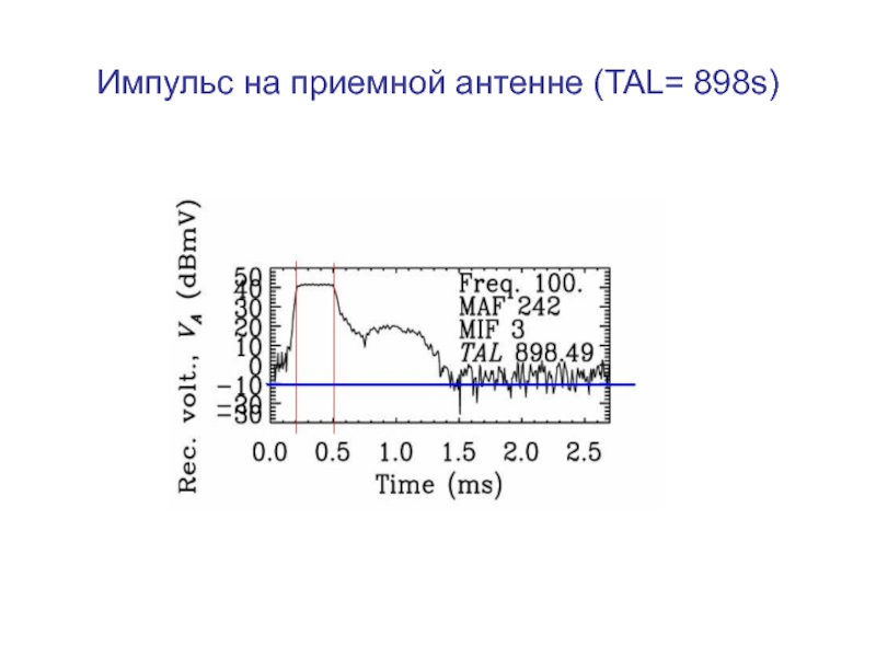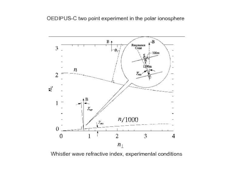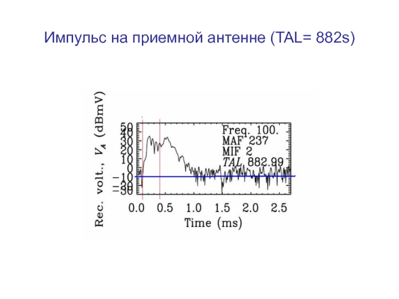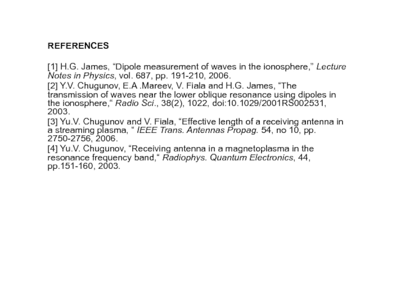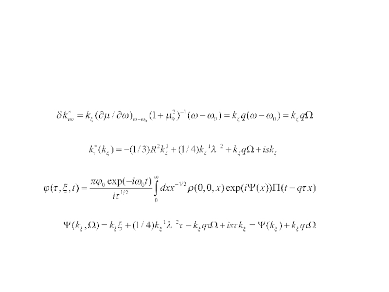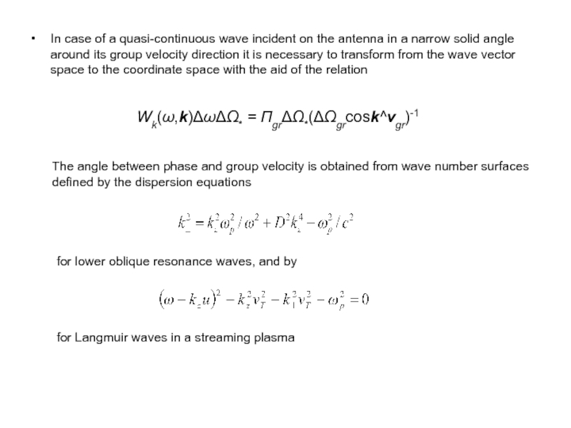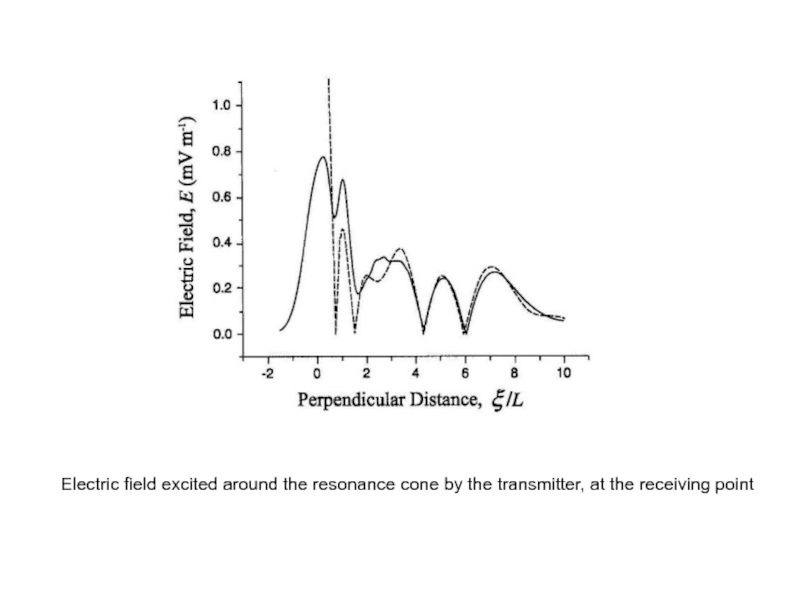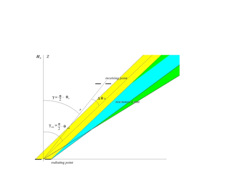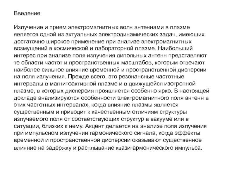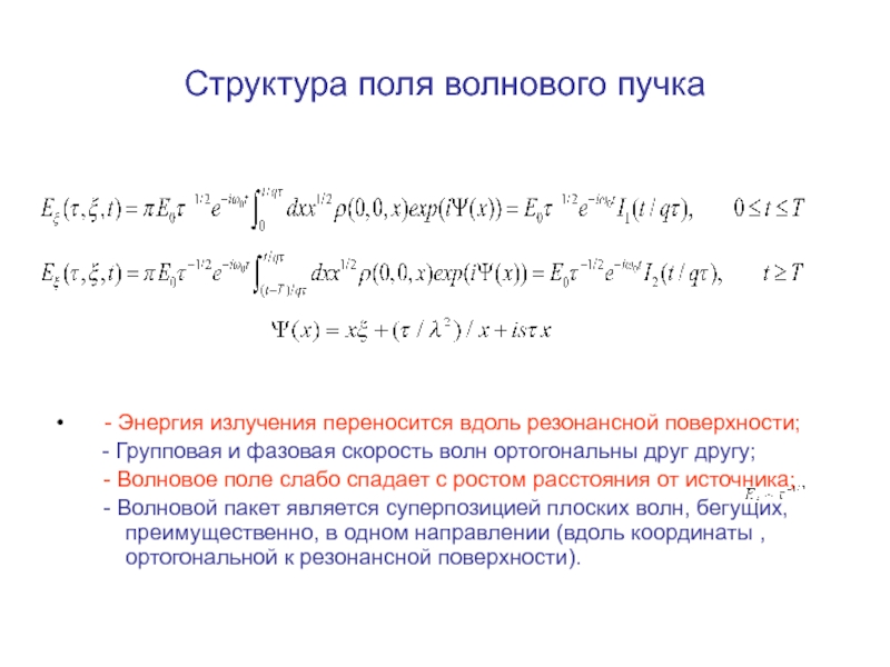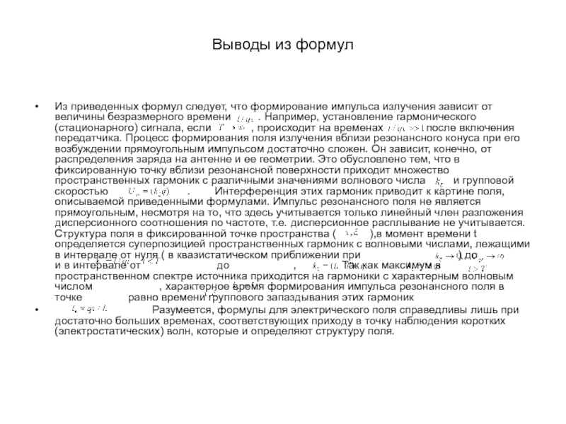 от величины безразмерного времени     . Например, установление гармонического (стационарного) сигнала, если       , происходит на временах       после включения передатчика. Процесс формирования поля излучения вблизи резонансного конуса при его возбуждении прямоугольным импульсом достаточно сложен. Он зависит, конечно, от распределения заряда на антенне и ее геометрии. Это обусловлено тем, что в фиксированную точку вблизи резонансной поверхности приходит множество пространственных гармоник с различными значениями волнового числа     и групповой скоростью             .    Интерференция этих гармоник приводит к картине поля, описываемой приведенными формулами. Импульс резонансного поля не является прямоугольным, несмотря на то, что здесь учитывается только линейный член разложения дисперсионного соотношения по частоте, т.е. дисперсионное расплывание не учитывается. Структура поля в фиксированной точке пространства (      ),в момент времени t определяется суперпозицией пространственных гармоник с волновыми числами, лежащими в интервале от нуля ( в квазистатическом приближении при                ) до                        и в интервале от             до           ,       . Так как максимум в пространственном спектре источника приходится на гармоники с характерным волновым числом           , характерное время формирования импульса резонансного поля в точке        равно времени группового запаздывания этих гармоник