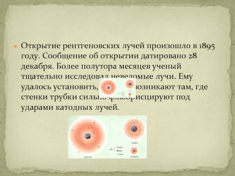 Слайд 8Открытие рентгеновских лучей произошло в 1895 году. Сообщение об открытии датировано