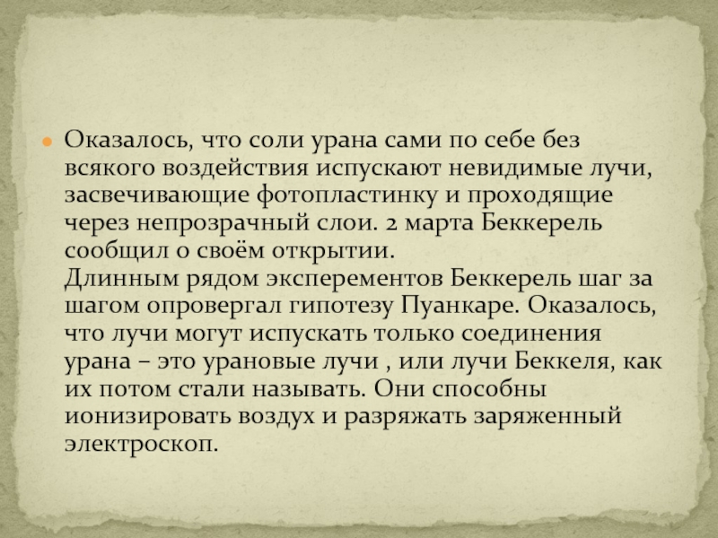 невидимые лучи, засвечивающие фотопластинку и проходящие через непрозрачный слои. 2 марта Беккерель сообщил о своём открытии. Длинным рядом эксперементов Беккерель шаг за шагом опровергал гипотезу Пуанкаре. Оказалось, что лучи могут испускать только соединения урана – это урановые лучи , или лучи Беккеля, как их потом стали называть. Они способны ионизировать воздух и разряжать заряженный электроскоп.