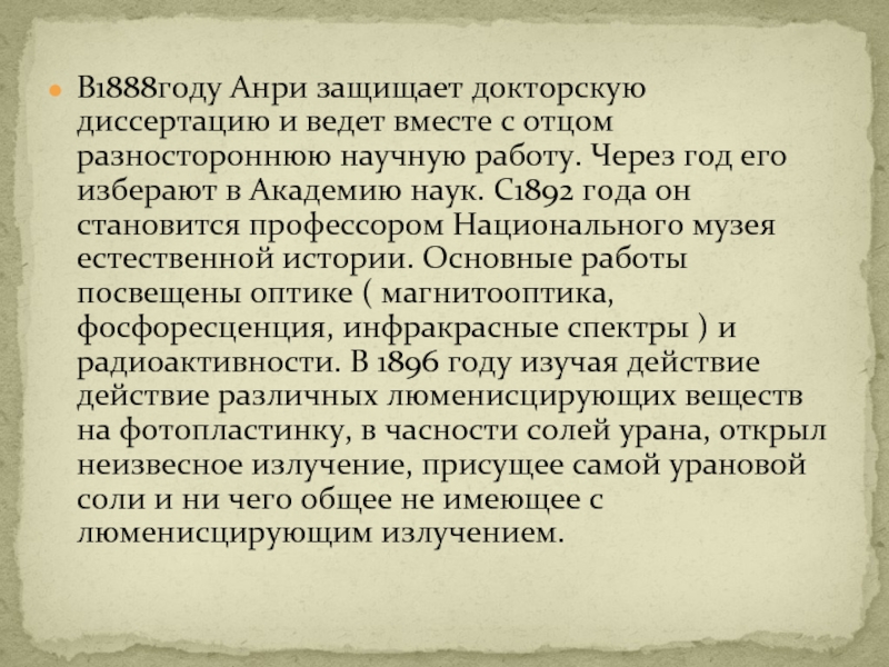 научную работу. Через год его изберают в Академию наук. С1892 года он становится профессором Национального музея естественной истории. Основные работы посвещены оптике ( магнитооптика, фосфоресценция, инфракрасные спектры ) и радиоактивности. В 1896 году изучая действие действие различных люменисцирующих веществ на фотопластинку, в часности солей урана, открыл неизвесное излучение, присущее самой урановой соли и ни чего общее не имеющее с люменисцирующим излучением.