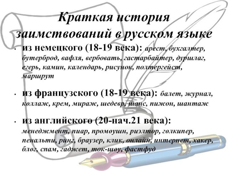 из английского (20-нач.21 века): менеджмент, пиар, промоушн, риэлтор, голкипер, пенальти, ринг, браузер, клик, онлайн, интернет, хакер, блог, спам, гаджет, ток-шоу, фастфуд