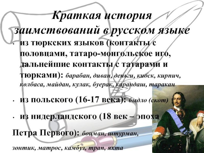 татаро-монгольское иго, дальнейшие контакты с татарами и тюрками): барабан, диван, деньги, киоск, кирпич, колбаса, майдан, кулак, буерак, карандаш, таракан