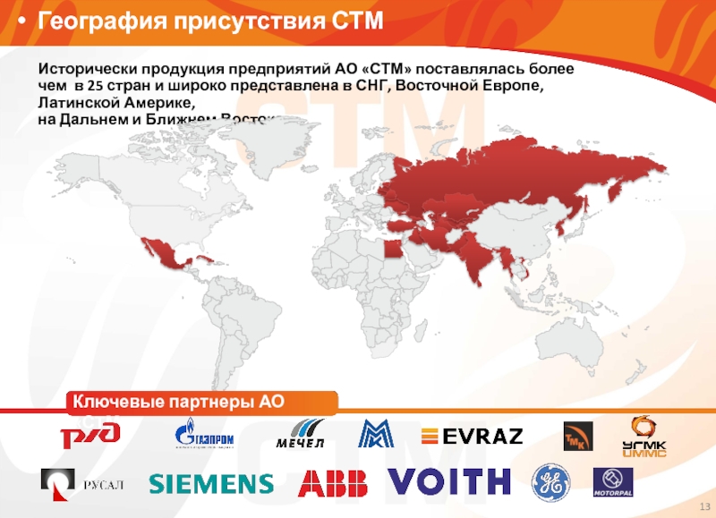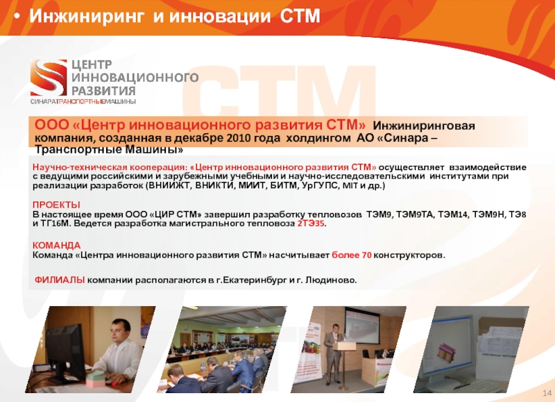 Научно-техническая кооперация: «Центр инновационного развития СТМ» осуществляет взаимодействие с ведущими российскими и зарубежными учебными и научно-исследовательскими институтами при реализации разработок (ВНИИЖТ, ВНИКТИ, МИИТ, БИТМ, УрГУПС, MIT и др.)