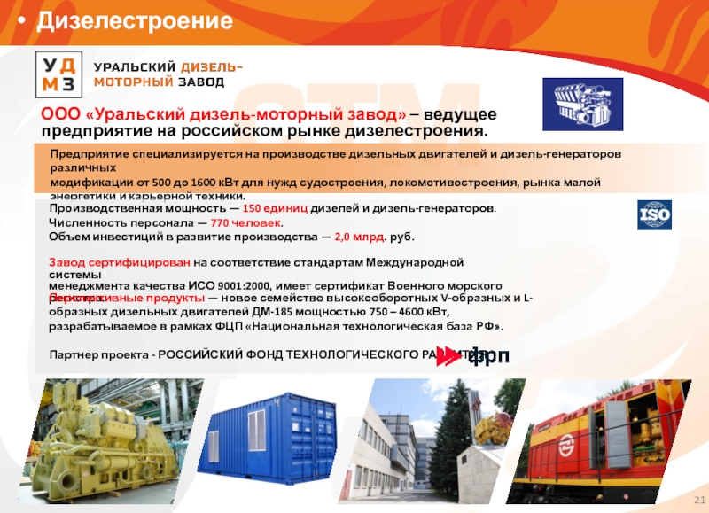 Перспективные продукты — новое семейство высокооборотных V-образных и L-образных дизельных двигателей ДМ-185 мощностью 750 – 4600 кВт, разрабатываемое в рамках ФЦП «Национальная технологическая база РФ».