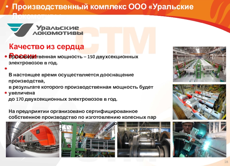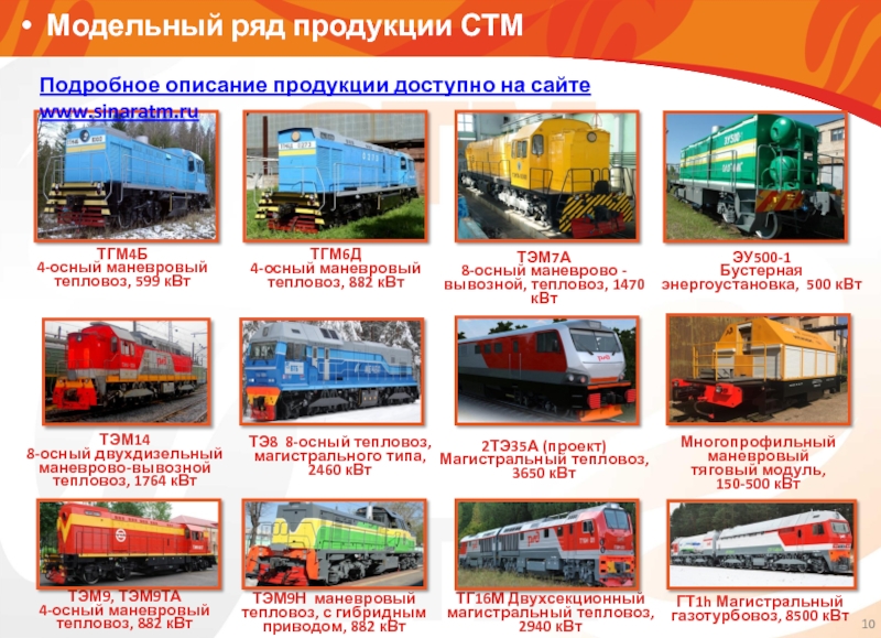 Дочернее предприятие АО «СТМ» по фирменному сервисному обслуживанию локомотивов различных серий: грузовых магистральных электровозов постоянного и переменного тока, грузовых маневровых и магистральных тепловозов, пассажирских электровозов и тепловозов ОАО «РЖД» и коммерческого рынка.
