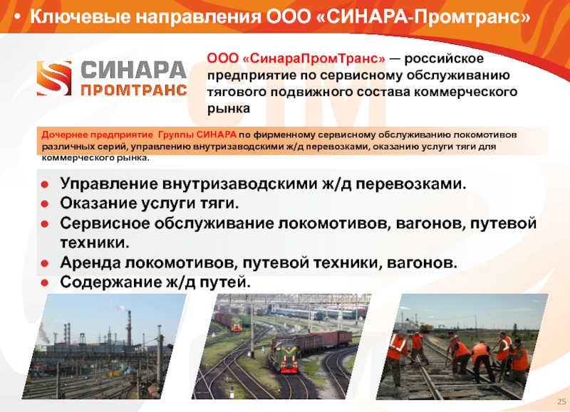 Дочернее предприятие Группы СИНАРА по фирменному сервисному обслуживанию локомотивов различных серий, управлению внутризаводскими ж/д перевозками, оказанию услуги тяги для коммерческого рынка.