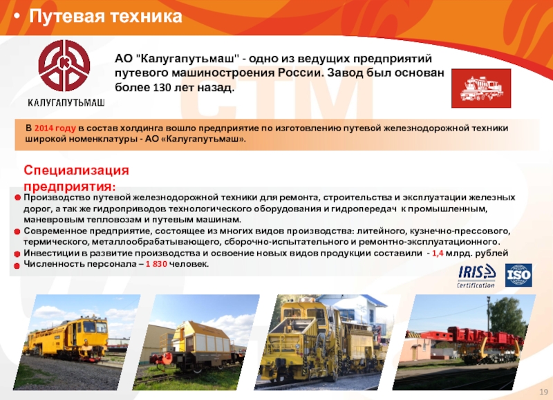В 2014 году в состав холдинга вошло предприятие по изготовлению путевой железнодорожной техники широкой номенклатуры - АО «Калугапутьмаш».