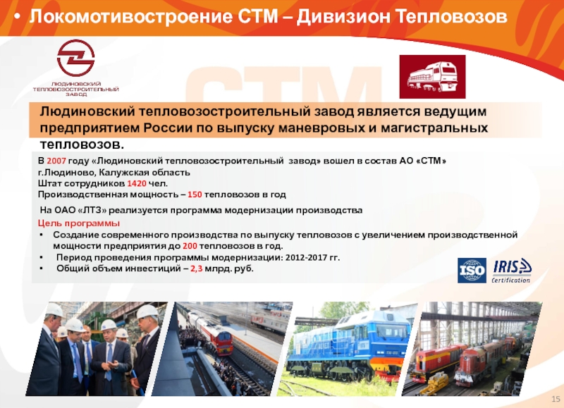 В 2007 году «Людиновский тепловозостроительный завод» вошел в состав АО «СТМ»