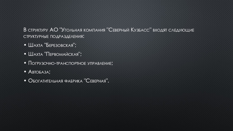 Слайд 3В структуру АО "Угольная компания "Северный Кузбасс" входят следующие структурные подразделения: