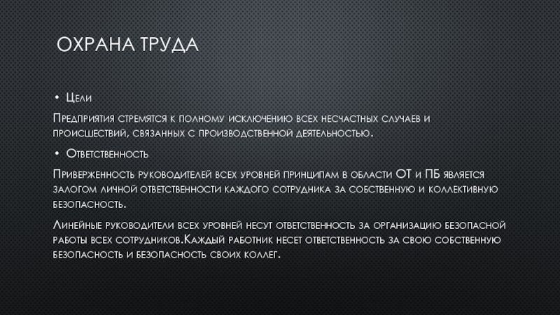 Приверженность руководителей всех уровней принципам в области ОТ и ПБ является залогом личной ответственности каждого сотрудника за собственную и коллективную безопасность.