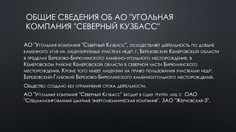 Слайд 2ОБЩИЕ СВЕДЕНИЯ ОБ АО "УГОЛЬНАЯ КОМПАНИЯ "СЕВЕРНЫЙ КУЗБАСС"