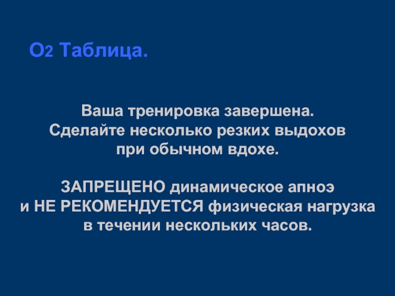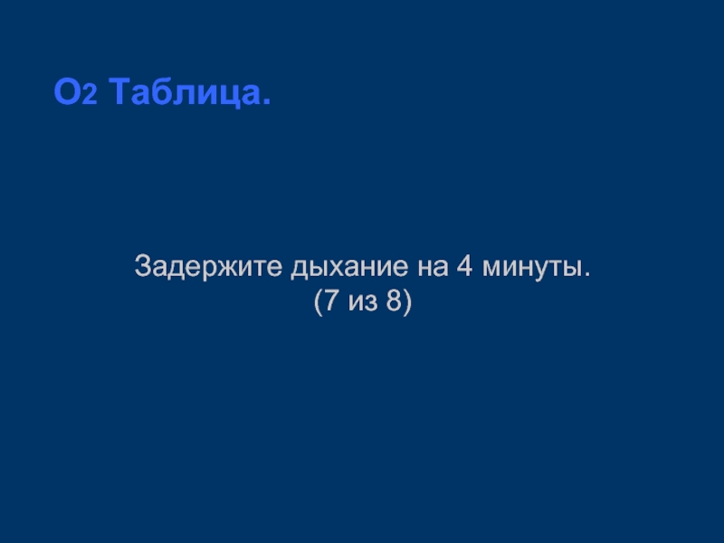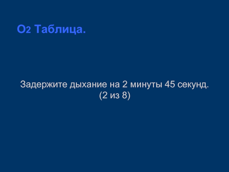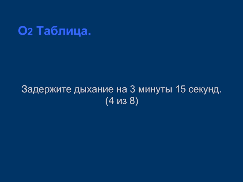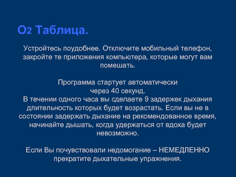 В течении одного часа вы сделаете 9 задержек дыхания длительность которых будет возрастать. Если вы не в состоянии задержать дыхание на рекомендованное время, начинайте дышать, когда удержаться от вдоха будет невозможно.