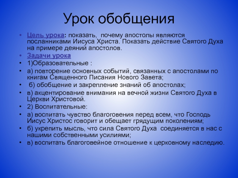 На уроке реализованы принципы: доступности изложения материала, принцип последовательности и систематичности при обобщении сведений, принцип воспитывающего обучения на примере возрастания учеников Иисуса Христа, святых апостолов.