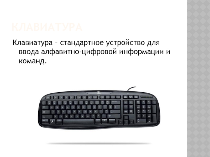 Клавиатура – стандартное устройство для ввода алфавитно-цифровой информации и команд.