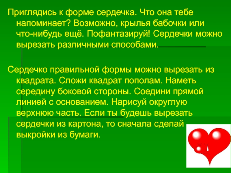 Слайд 2Приглядись к форме сердечка. Что она тебе напоминает? Возможно, крылья бабочки