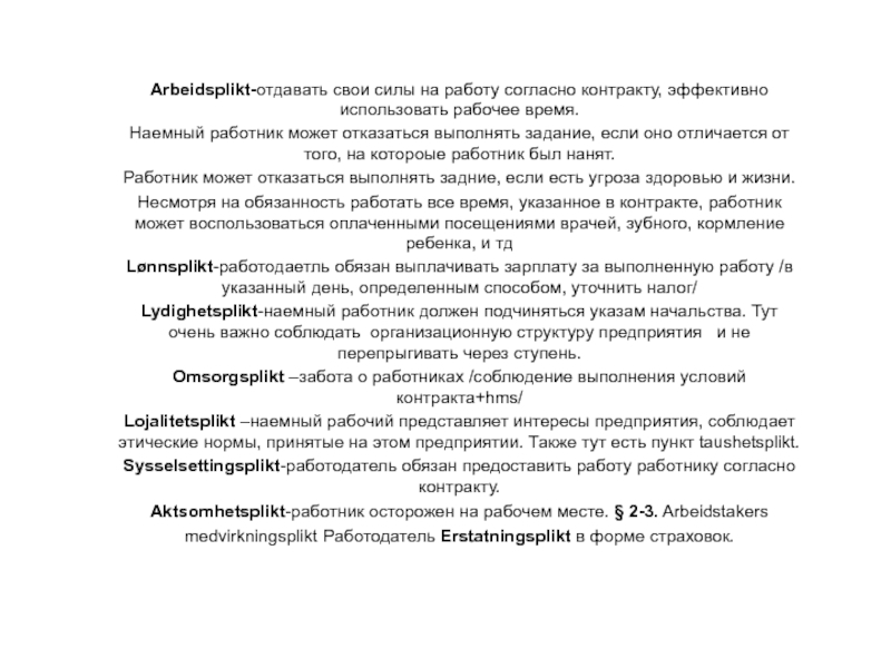 Слайд 6Arbeidsplikt-отдавать свои силы на работу согласно контракту, эффективно использовать рабочее время.