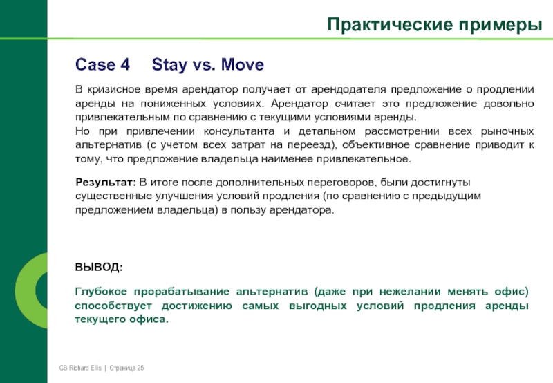 Глубокое прорабатывание альтернатив (даже при нежелании менять офис) способствует достижению самых выгодных условий продления аренды текущего офиса.