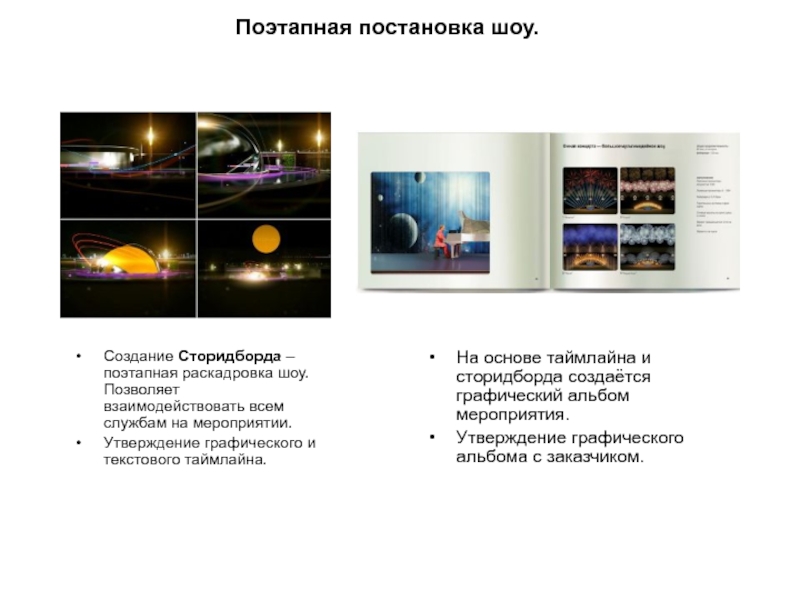 На основе таймлайна и сторидборда создаётся графический альбом мероприятия.
