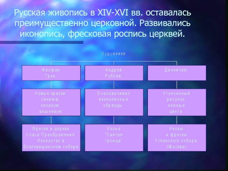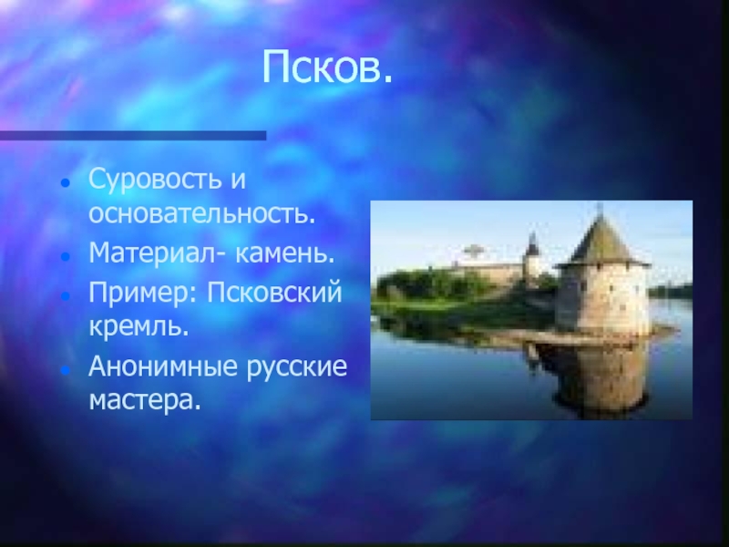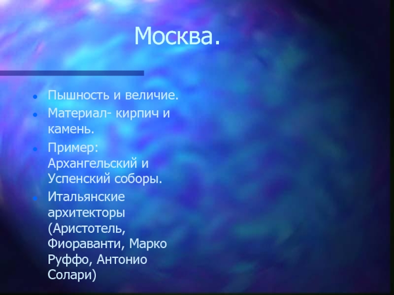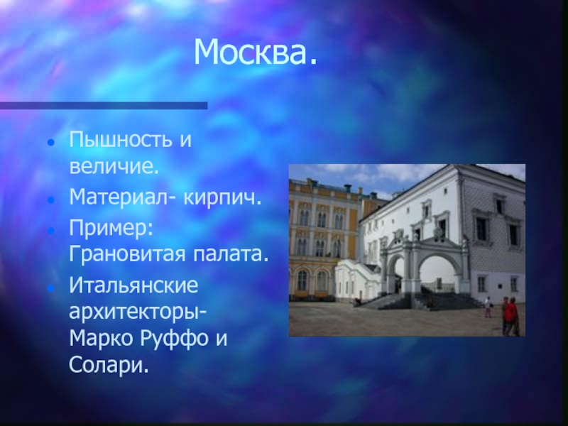Церковная. Шатровый стиль, материал- кирпич. Архитекторы- Барма и Постник. Пример: Собор Василия Блаженного.
