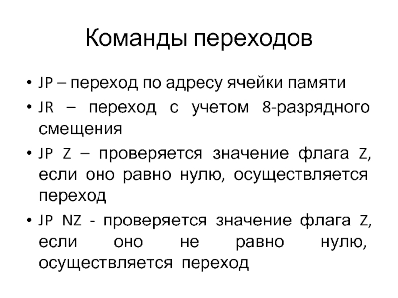 JP Z – проверяется значение флага Z, если оно равно нулю, осуществляется переход
