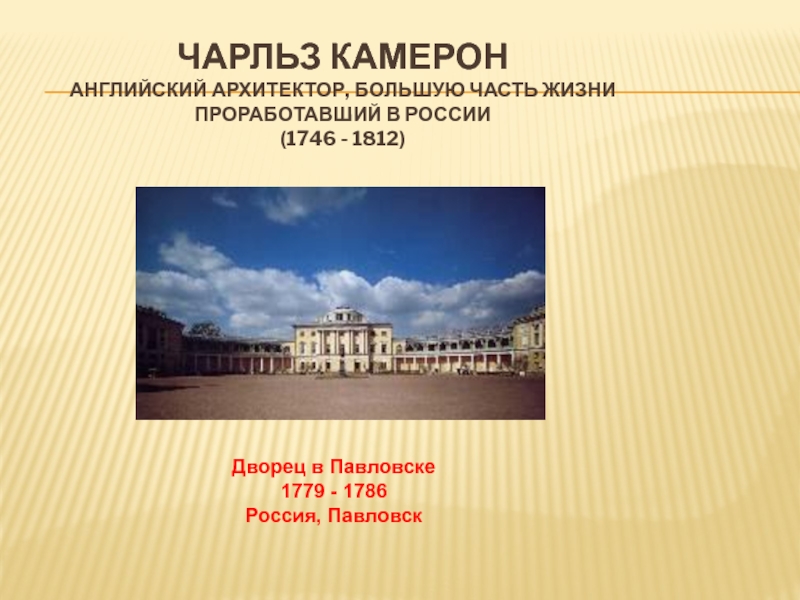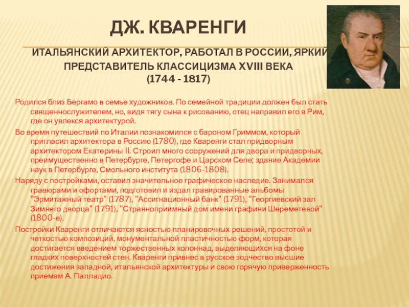 Во время путешествий по Италии познакомился с бароном Гриммом, который пригласил архитектора в Россию (1780), где Кваренги стал придворным архитектором Екатерины II. Строил много сооружений для двора и придворных, преимущественно в Петербурге, Петергофе и Царском Селе; здание Академии наук в Петербурге, Смольного института (1806-1808).