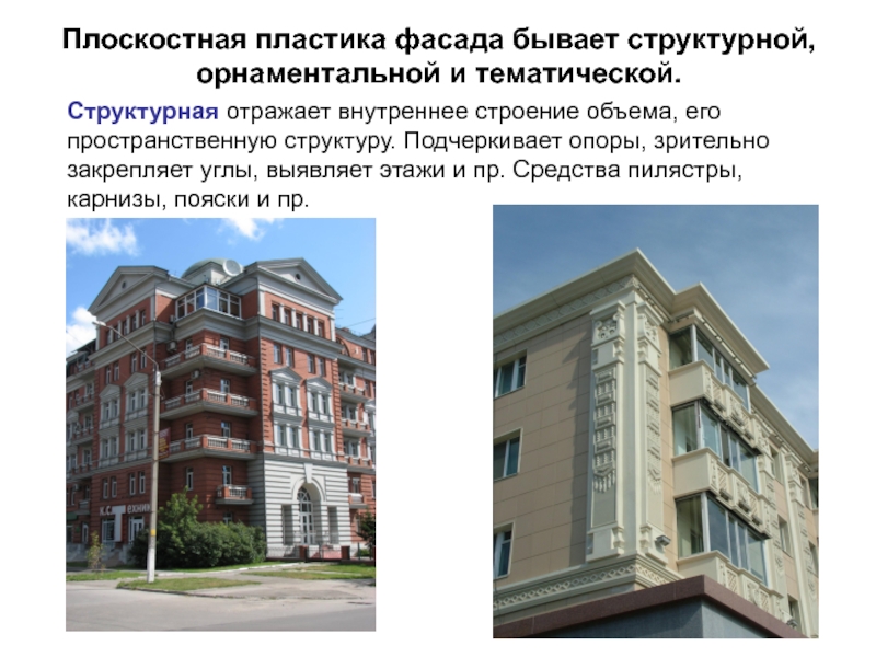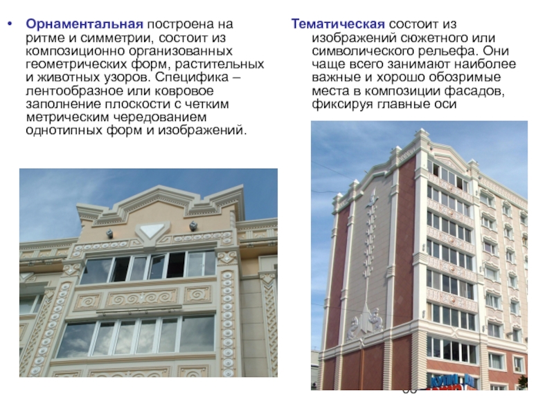 Тематическая состоит из изображений сюжетного или символического рельефа. Они чаще всего занимают наиболее важные и хорошо обозримые места в композиции фасадов, фиксируя главные оси