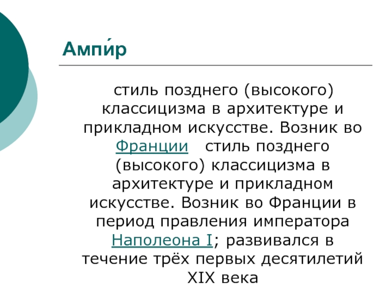 искусстве. Возник во Франции  стиль позднего (высокого) классицизма в архитектуре и прикладном искусстве. Возник во Франции в период правления императора Наполеона I; развивался в течение трёх первых десятилетий XIX века