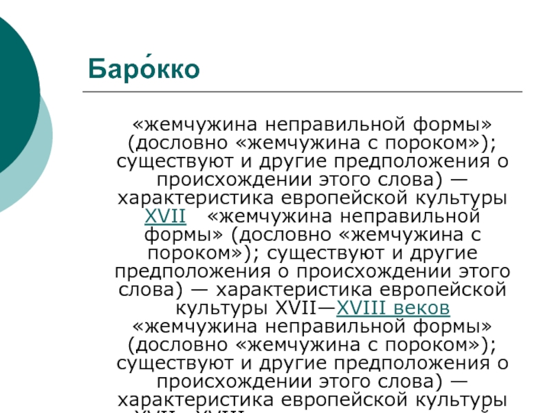 и другие предположения о происхождении этого слова) — характеристика европейской культуры XVII  «жемчужина неправильной формы» (дословно «жемчужина с пороком»); существуют и другие предположения о происхождении этого слова) — характеристика европейской культуры XVII—XVIII веков  «жемчужина неправильной формы» (дословно «жемчужина с пороком»); существуют и другие предположения о происхождении этого слова) — характеристика европейской культуры XVII—XVIII веков, центром которой была Италия  «жемчужина неправильной формы» (дословно «жемчужина с пороком»); существуют и другие предположения о происхождении этого слова) — характеристика европейской культуры XVII—XVIII веков, центром которой была Италия. Стиль барокко появился в XVI—XVII веках в итальянских городах: Риме  «жемчужина неправильной формы» (дословно «жемчужина с пороком»); существуют и другие предположения о происхождении этого слова) — характеристика европейской культуры XVII—XVIII веков, центром которой была Италия. Стиль барокко появился в XVI—XVII веках в итальянских городах: Риме, Мантуе  «жемчужина неправильной формы» (дословно «жемчужина с пороком»); существуют и другие предположения о происхождении этого слова) — характеристика европейской культуры XVII—XVIII веков, центром которой была Италия. Стиль барокко появился в XVI—XVII веках в итальянских городах: Риме, Мантуе, Венеции  «жемчужина неправильной формы» (дословно «жемчужина с пороком»); существуют и другие предположения о происхождении этого слова) — характеристика европейской культуры XVII—XVIII веков, центром которой была Италия. Стиль барокко появился в XVI—XVII веках в итальянских городах: Риме, Мантуе, Венеции, Флоренции. Эпоху барокко принято считать началом триумфального шествия «западной цивилизации».Барокко противостояло классицизму и рационализму.