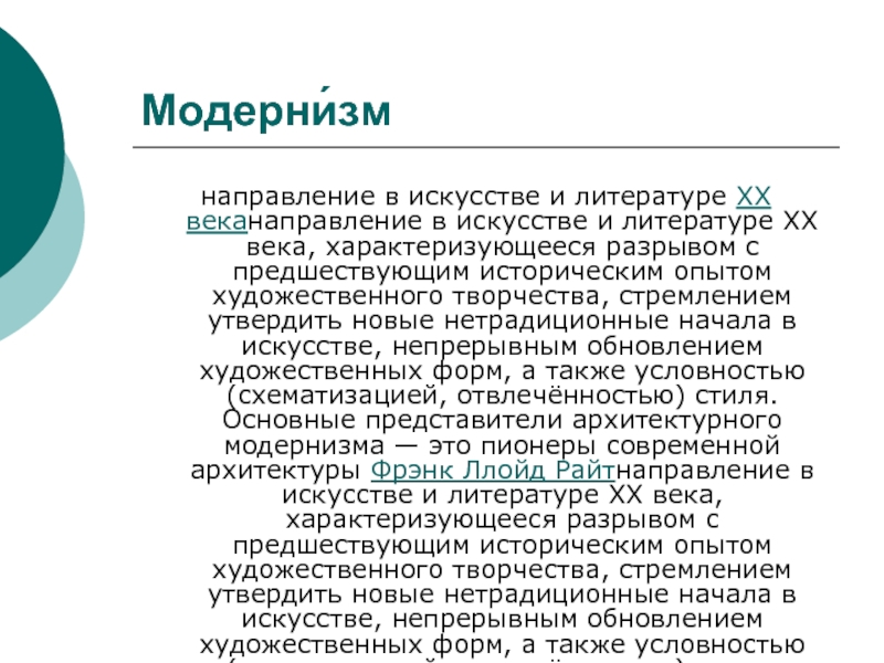 литературе XX века, характеризующееся разрывом с предшествующим историческим опытом художественного творчества, стремлением утвердить новые нетрадиционные начала в искусстве, непрерывным обновлением художественных форм, а также условностью (схематизацией, отвлечённостью) стиля. Основные представители архитектурного модернизма — это пионеры современной архитектуры Фрэнк Ллойд Райтнаправление в искусстве и литературе XX века, характеризующееся разрывом с предшествующим историческим опытом художественного творчества, стремлением утвердить новые нетрадиционные начала в искусстве, непрерывным обновлением художественных форм, а также условностью (схематизацией, отвлечённостью) стиля. Основные представители архитектурного модернизма — это пионеры современной архитектуры Фрэнк Ллойд Райт, Вальтер Гропиуснаправление в искусстве и литературе XX века, характеризующееся разрывом с предшествующим историческим опытом художественного творчества, стремлением утвердить новые нетрадиционные начала в искусстве, непрерывным обновлением художественных форм, а также условностью (схематизацией, отвлечённостью) стиля. Основные представители архитектурного модернизма — это пионеры современной архитектуры Фрэнк Ллойд Райт, Вальтер Гропиус, Рихард Нойтранаправление в искусстве и литературе XX века, характеризующееся разрывом с предшествующим историческим опытом художественного творчества, стремлением утвердить новые нетрадиционные начала в искусстве, непрерывным обновлением художественных форм, а также условностью (схематизацией, отвлечённостью) стиля. Основные представители архитектурного модернизма — это пионеры современной архитектуры Фрэнк Ллойд Райт, Вальтер Гропиус, Рихард Нойтра, Людвиг Мис ван Дер Роэнаправление в искусстве и литературе XX века, характеризующееся разрывом с предшествующим историческим опытом художественного творчества, стремлением утвердить новые нетрадиционные начала в искусстве, непрерывным обновлением художественных форм, а также условностью (схематизацией, отвлечённостью) стиля. Основные представители архитектурного модернизма — это пионеры современной архитектуры Фрэнк Ллойд Райт, Вальтер Гропиус, Рихард Нойтра, Людвиг Мис ван Дер Роэ, Ле Корбюзьенаправление в искусстве и литературе XX века, характеризующееся разрывом с предшествующим историческим опытом художественного творчества, стремлением утвердить новые нетрадиционные начала в искусстве, непрерывным обновлением художественных форм, а также условностью (схематизацией, отвлечённостью) стиля. Основные представители архитектурного модернизма — это пионеры современной архитектуры Фрэнк Ллойд Райт, Вальтер Гропиус, Рихард Нойтра, Людвиг Мис ван Дер Роэ, Ле Корбюзье, Алвар Аалтонаправление в искусстве и литературе XX века, характеризующееся разрывом с предшествующим историческим опытом художественного творчества, стремлением утвердить новые нетрадиционные начала в искусстве, непрерывным обновлением художественных форм, а также условностью (схематизацией, отвлечённостью) стиля. Основные представители архитектурного модернизма — это пионеры современной архитектуры Фрэнк Ллойд Райт, Вальтер Гропиус, Рихард Нойтра, Людвиг Мис ван Дер Роэ, Ле Корбюзье, Алвар Аалто, Оскар Нимейер, а также некоторые другие.