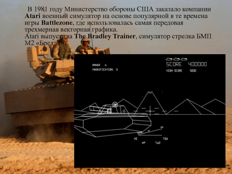 Слайд 3 В 1981 году Министерство обороны США заказало компании Atari военный симулятор