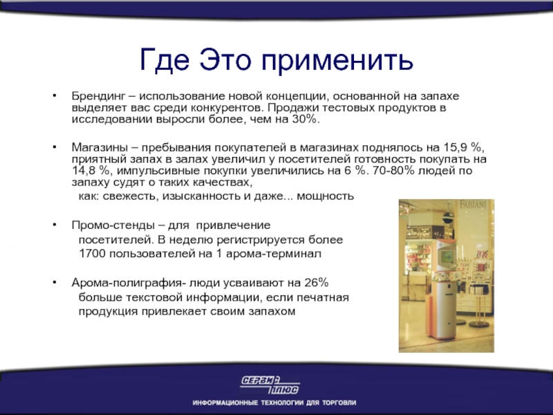 Магазины – пребывания покупателей в магазинах поднялось на 15,9 %, приятный запах в залах увеличил у посетителей готовность покупать на 14,8 %, импульсивные покупки увеличились на 6 %. 70-80% людей по запаху судят о таких качествах,
