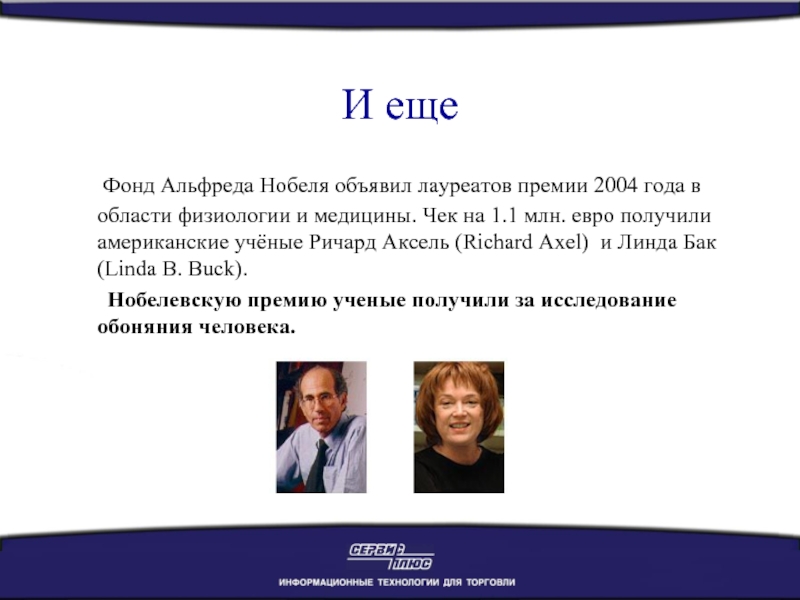 в области физиологии и медицины. Чек на 1.1 млн. евро получили американские учёные Ричард Аксель (Richard Axel) и Линда Бак (Linda B. Buck).